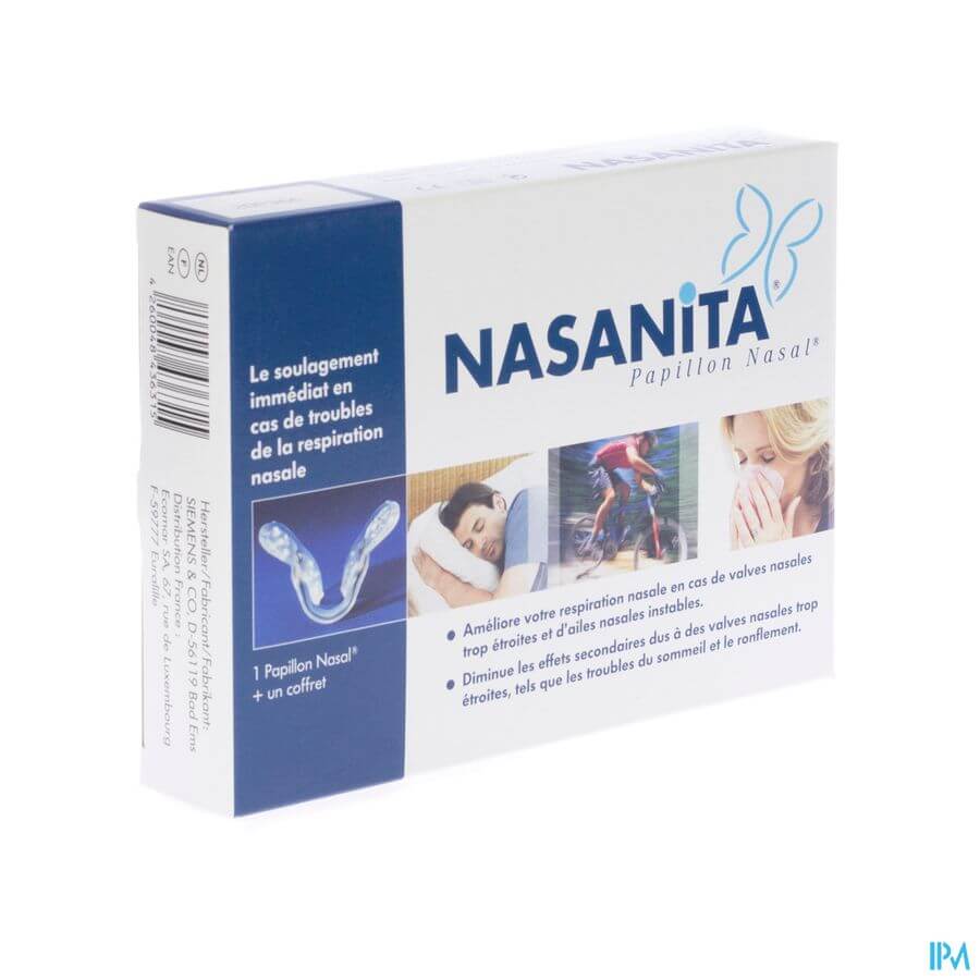 Bon nombre de personnes souffrent de troubles en respiration nasale vu l'étroitesse de leurs valves nasales ou l'instabilité des ailes nasales. Le Papillon Nasal Nasanita® leur vient en aide en se plaçant tout simplement à l'avant de la zone nasale. Ses ailes en silicone flexible s'adaptent de manière optimale à la forme du nez tout en élargissant les valves nasales et en stabilisant les ailes du nez de l'intérieur en toute précision.