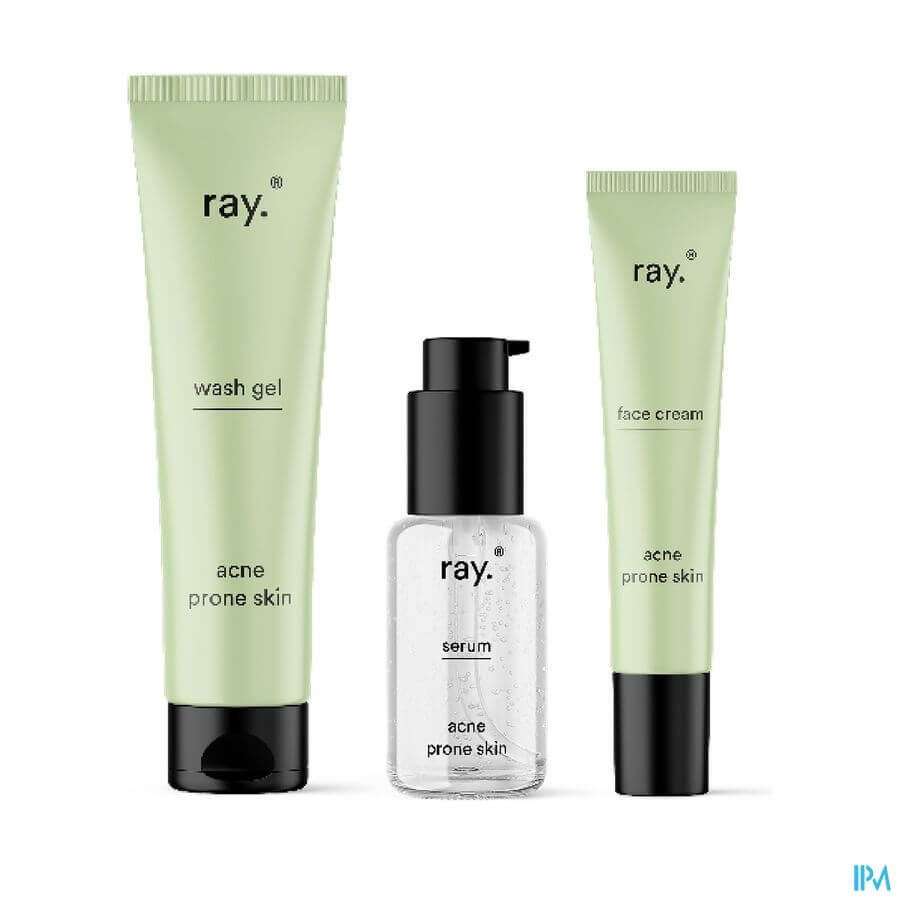 Cette routine comprend le Nettoyant Ray pour Peau Acnéique (100ml), le Sérum Ray pour Peau Acnéique (30ml) et la Crème Visage Ray pour Peau Acnéique (40ml).